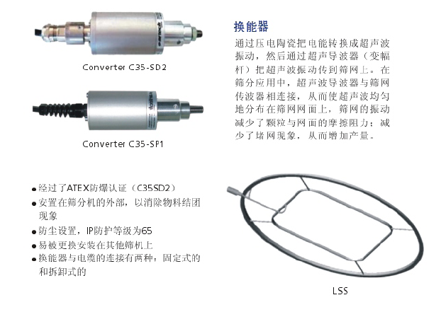 超聲波發(fā)生器主要作用是利用壓電陶瓷的壓電效應(yīng)把電 能轉(zhuǎn)換成機(jī)械能。超聲波振動(dòng)篩分系統(tǒng)是一種可靠的篩分系 統(tǒng),是解決當(dāng)前篩分過程中網(wǎng)眼堵塞有效的方法,此系統(tǒng) 由超聲波電源、換能器、共振環(huán)三部分組成。超聲波電源產(chǎn) 生的高頻電流由換能器轉(zhuǎn)換成正弦形式的縱向振蕩波(超聲 波),這些超聲波傳到共振環(huán)及篩網(wǎng)上產(chǎn)生共振.然后均勻 傳輸至篩面。篩網(wǎng)上的物料在做低頻振動(dòng)的同時(shí),疊加上超 聲振動(dòng),既可防止網(wǎng)孔堵塞,又可使篩分機(jī)效率大大提高。