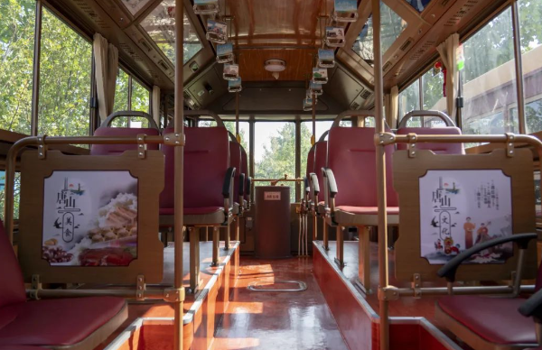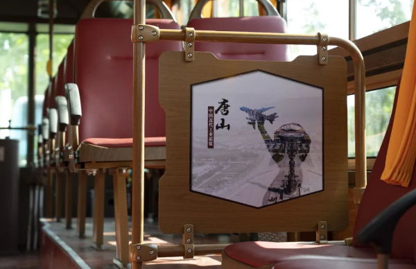 車身外形與眾不同,車內文化也極具特色。交發(fā)集團以“一車一主題”為原則,打造了工業(yè)歷史、旅游景點、特色美食、戲曲文化等多個主題文化車廂。利用燈箱、擋板、拉手等車內設施,以圖文并茂的形式介紹唐山文化,串起唐山百余年發(fā)展的歷史脈絡。鐺鐺車成為了傳遞歷史文化的“流動課堂”,整個車廂營造出濃厚的特色文化氛圍。